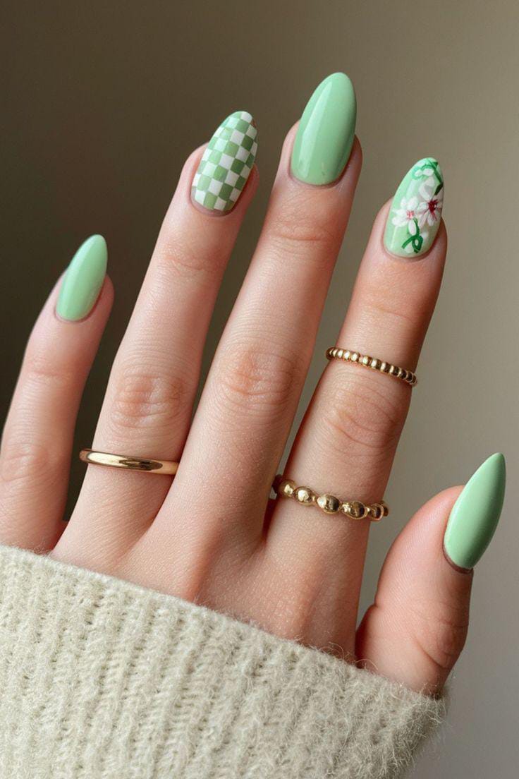 Light pastel green nails are styled with checkered patterns and delicate floral accents. The overall look is fun, trendy, and youthful, perfect for a playful summer aesthetic.