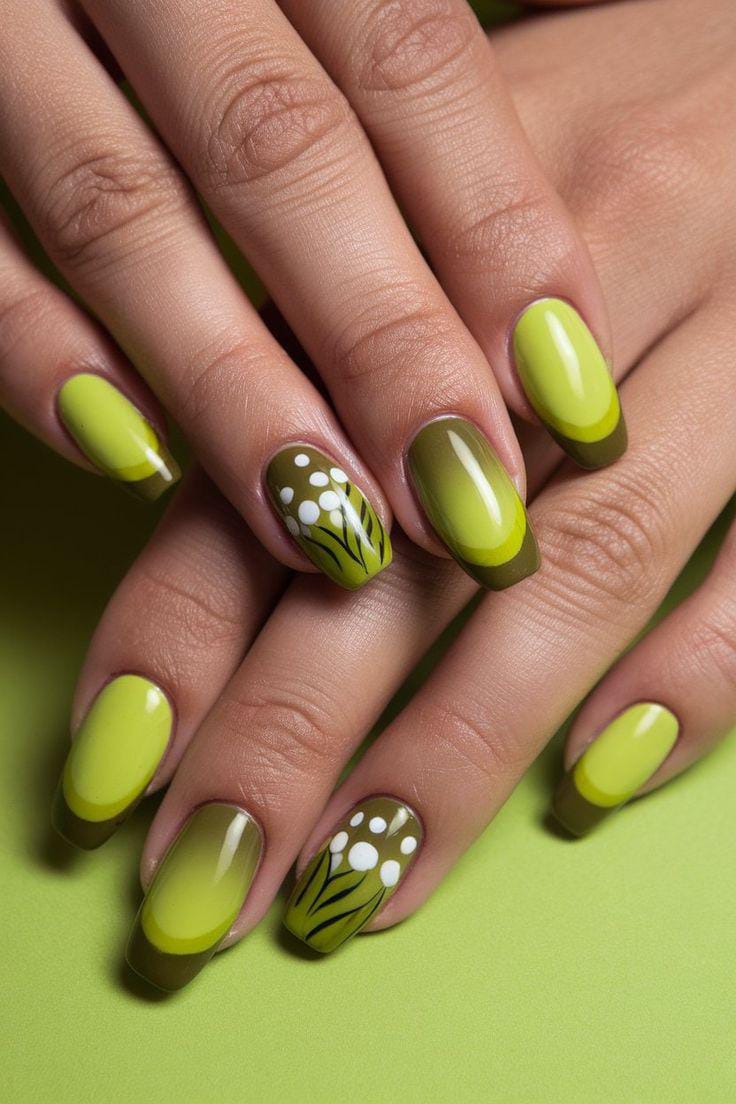 Muted olive and light green ombre tones blend beautifully with subtle floral accents. The overall look is earthy, calm, and perfect for a more natural summer aesthetic.