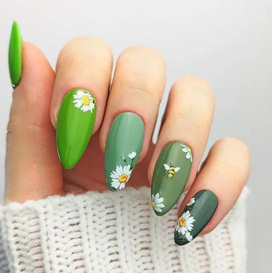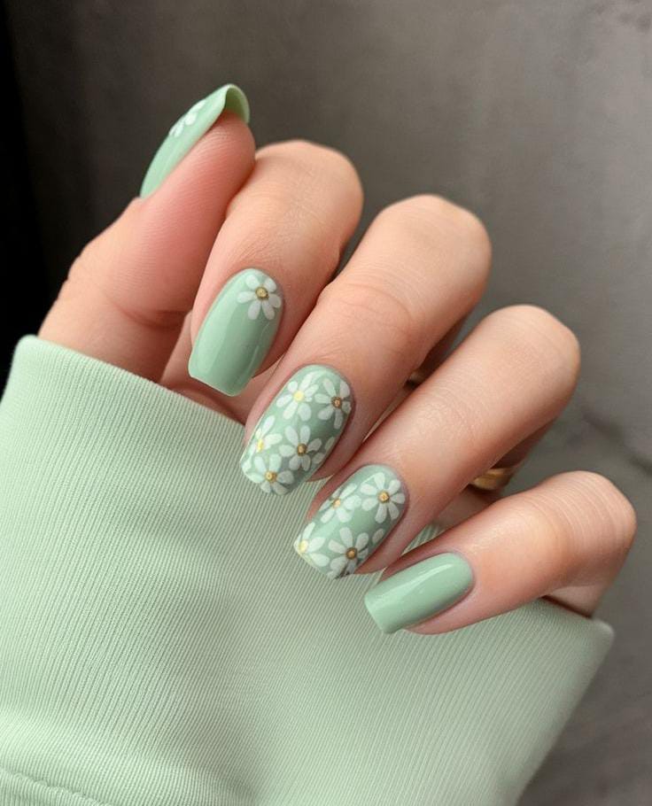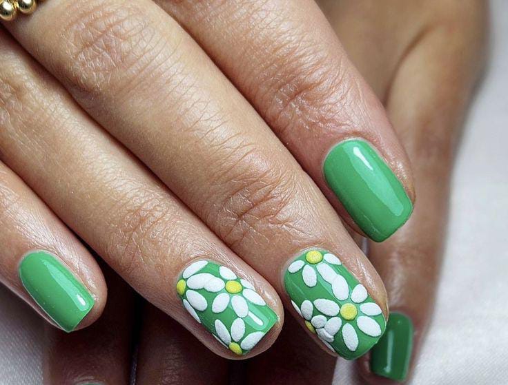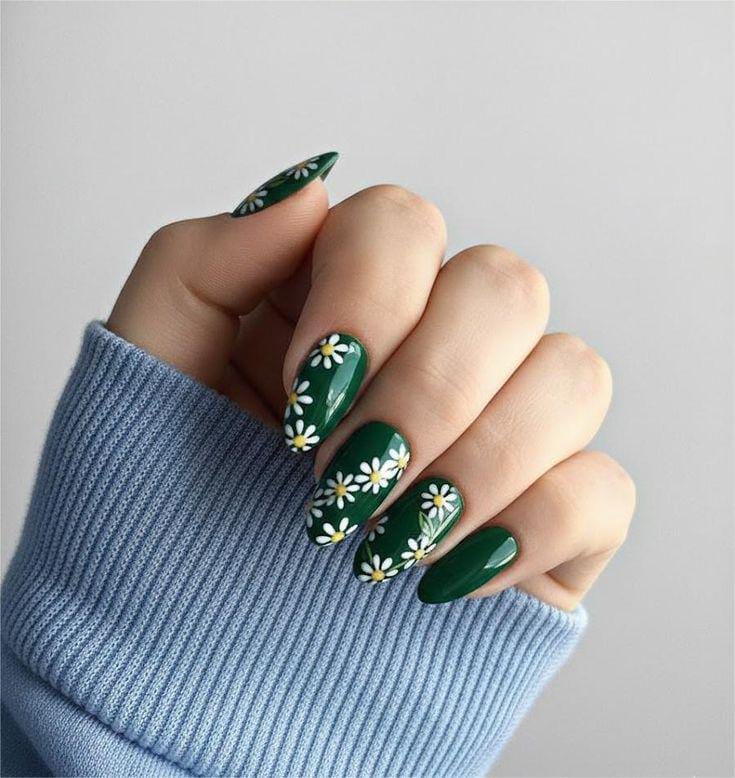Rich forest green nails paired with tiny white daisies create a cozy yet fresh design. It feels inspired by nature and works perfectly for a relaxed, green-summer vibe.
