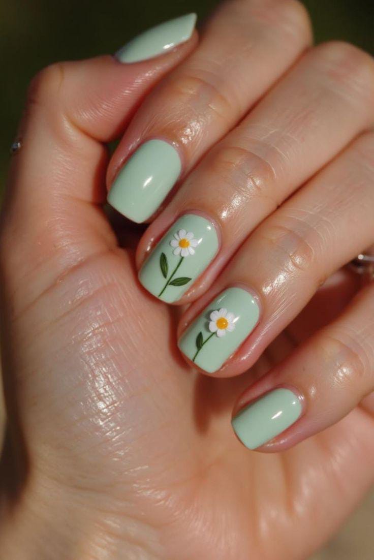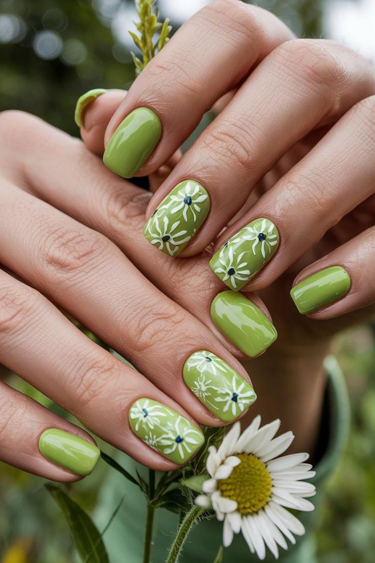 Soft lime-green nails keep things bright and minimal, while delicate white daisies add a cheerful floral touch. The look feels light, sunny, and effortlessly cute for summer days.