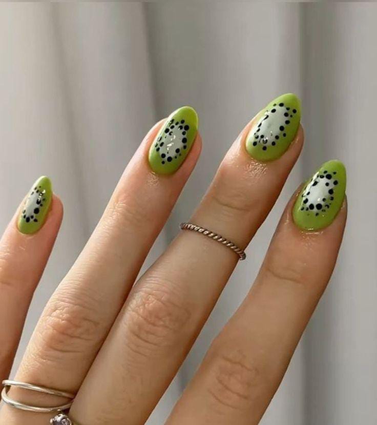 Bright green nails with tiny black dot details resemble a fun kiwi-inspired pattern. The look is bold, quirky, and ideal for adding a playful twist to summer nails.