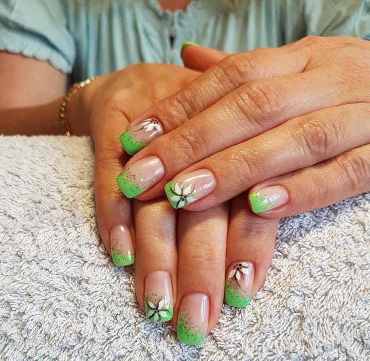This design mixes light and deep green shades, shimmer accent with soft floral accents for a fresh, nature-inspired look. The glossy finish and delicate flowers give it a playful yet polished summer vibe.