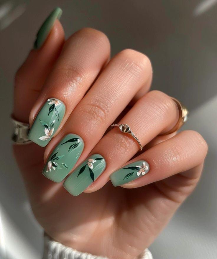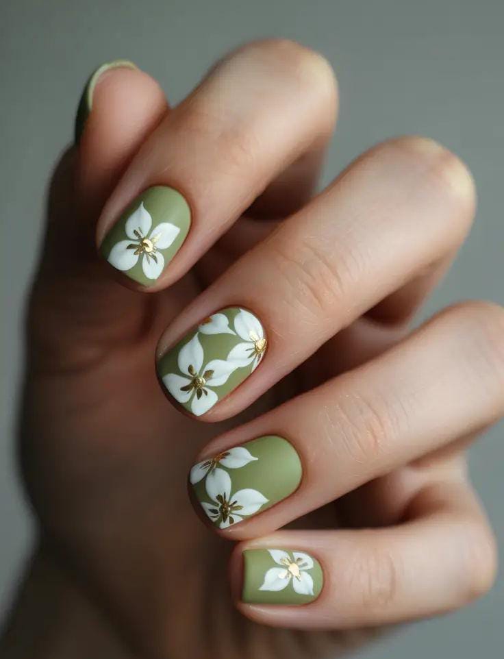 Muted sage green nails are enhanced with hand-painted white flowers and leafy details. The design gives off a calm, nature-inspired summer vibe that feels relaxed yet polished.