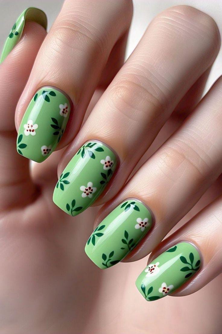 This look uses a soft green base with tiny white flowers and leafy details scattered across the nails. It gives off a cozy, countryside summer vibe that feels sweet and effortless.