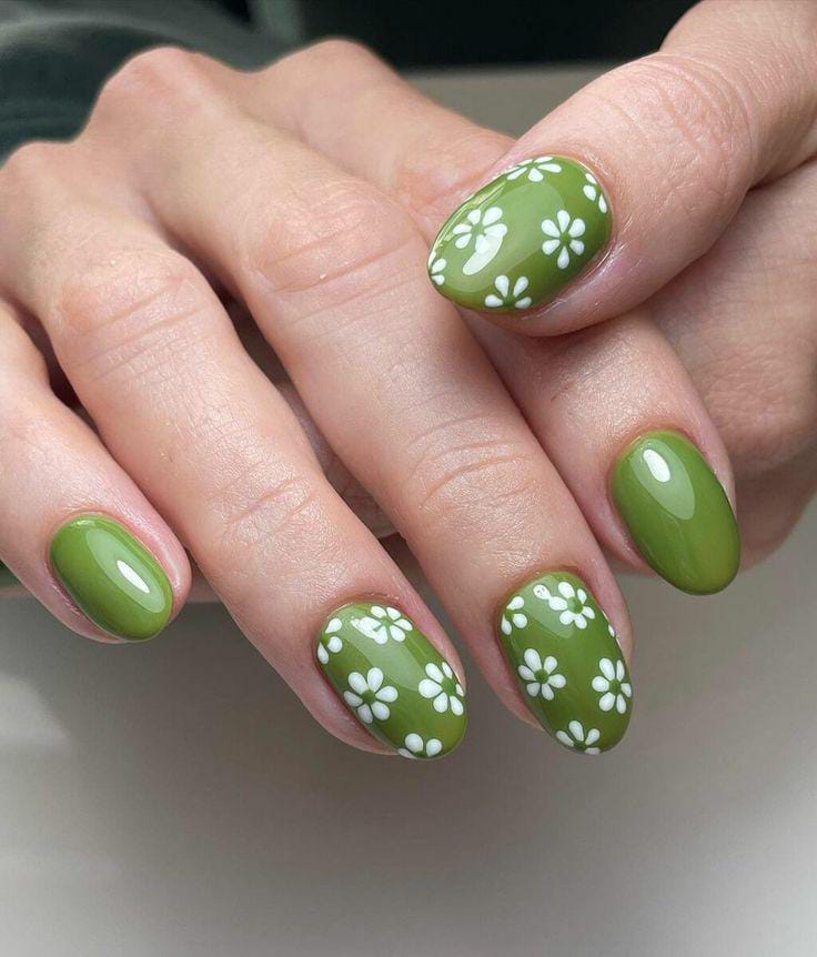 This design features a deep green base color with delicate white flowers scattered across the nails. The subtle contrast between the dark background and the bright florals gives a fresh and sophisticated vibe, perfect for the summer.