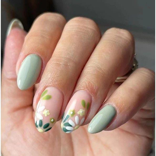 A soft green polish combined with green and white flowers on nude base. The design gives a calm, serene summer feel, with the green base complementing the floral artwork perfectly for a nature-inspired touch.