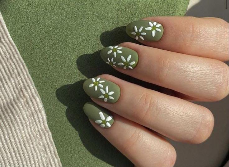 A muted olive-green base paired with white daisy patterns creates a calm, earthy aesthetic. The design feels fresh and outdoorsy, perfect for a relaxed summer look.