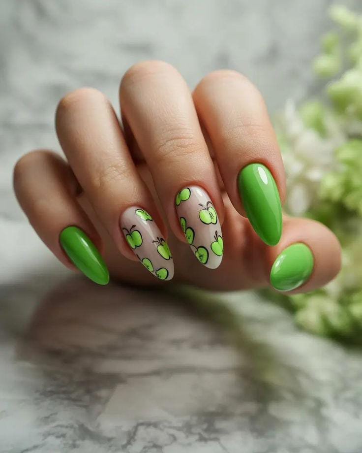 Featuring vibrant green and neutral tones, this design incorporates a playful apple pattern. It’s a fun and fruity nail design that captures the essence of summer in a quirky and stylish way.