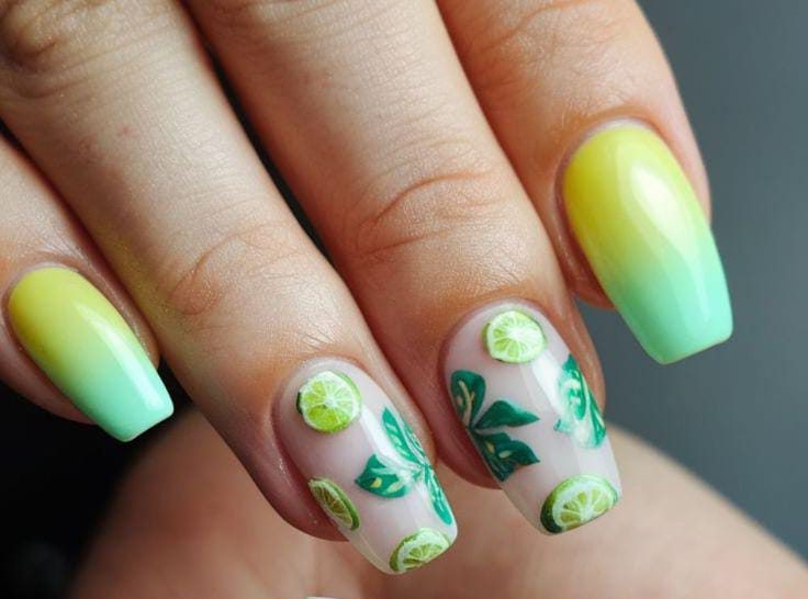 A lively mix of lime green ombre shades with lemon slice nude nail art and tiny droplet details. The vibe is zesty, energetic, and refreshing—perfect for sunny days and summer vacation moods.