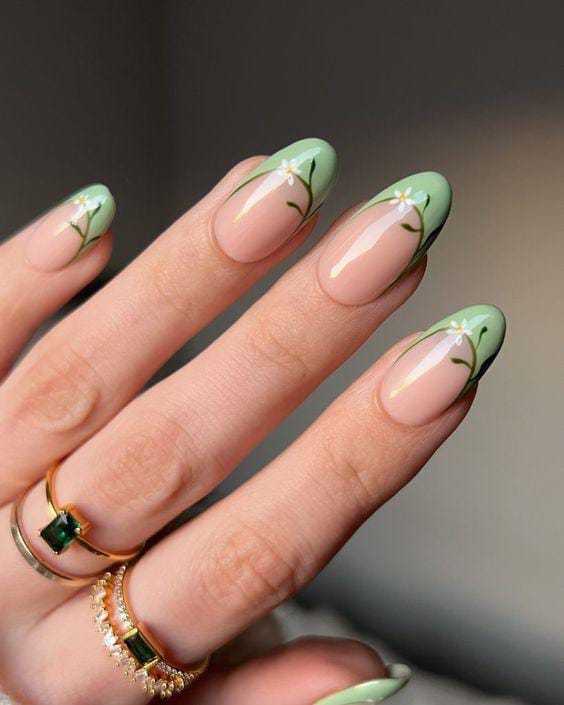 These nails combine a natural nude base with grassy green tips, subtle floral and shimmer details. The look is soft yet lively, giving off a calm, garden-inspired summer vibe.