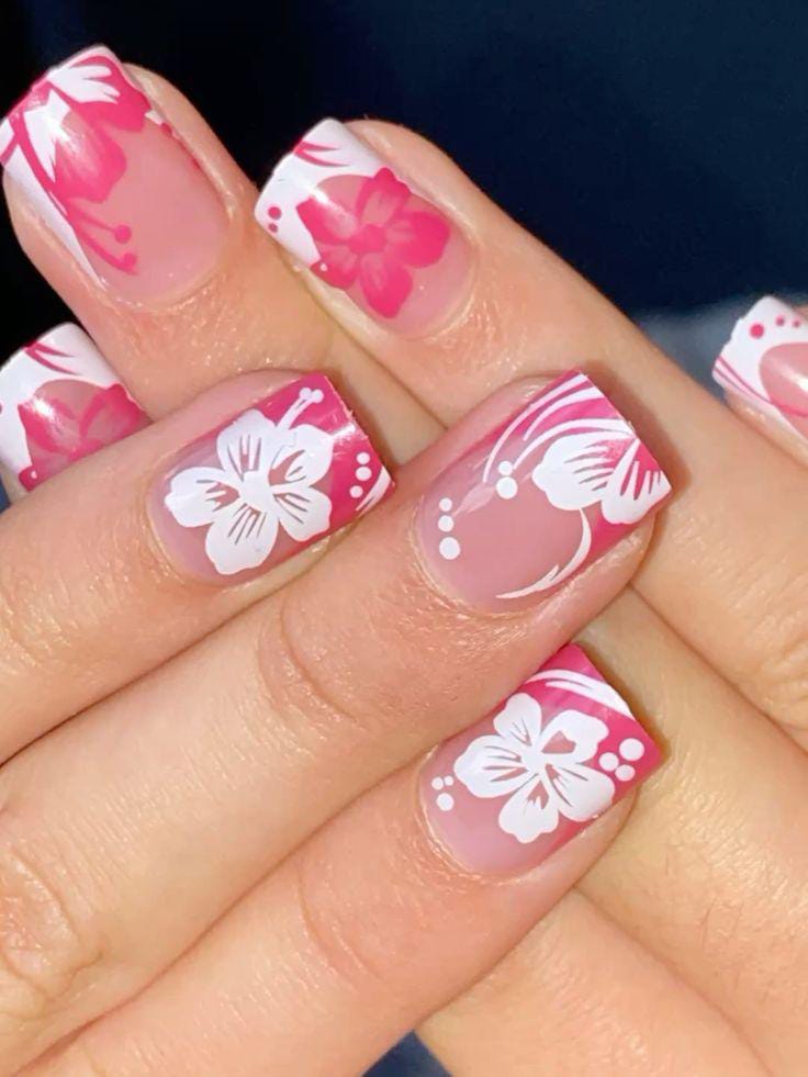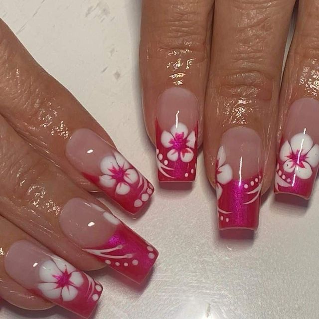 Bold pink tips blend into a natural nude base, decorated with crisp white hibiscus flowers and dotted accents for a vibrant tropical vibe.
