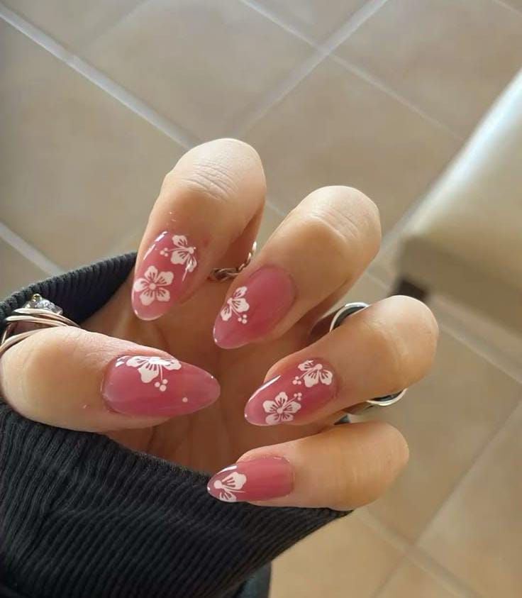 This look blends soft pink polish with white hibiscus flowers and green accents, creating a light and breezy island-inspired style.
