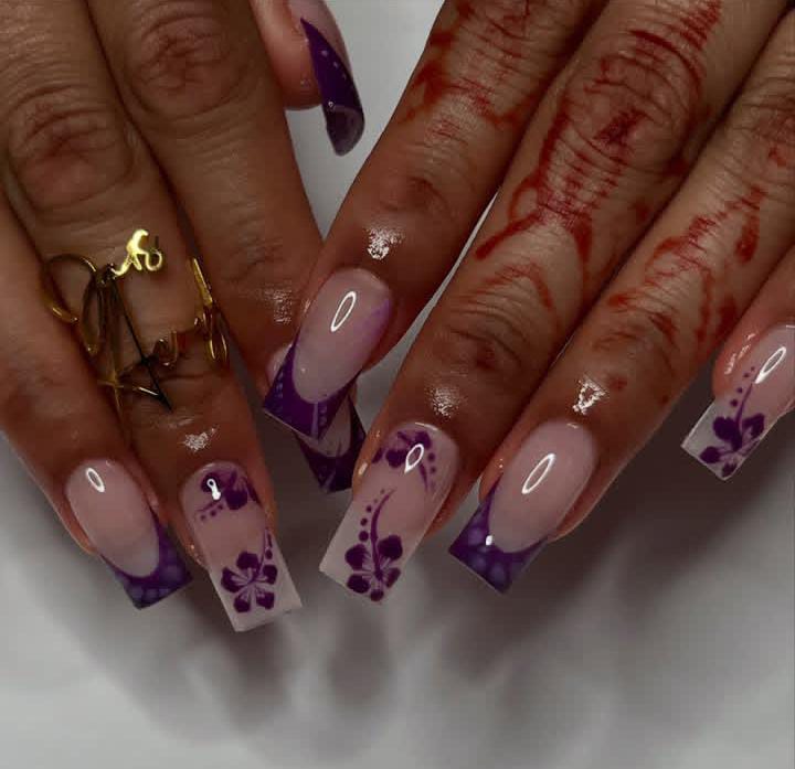 This design blends soft nude bases with deep purple French tips, accented by delicate hibiscus flowers and dotted swirls for a bold yet feminine vibe.