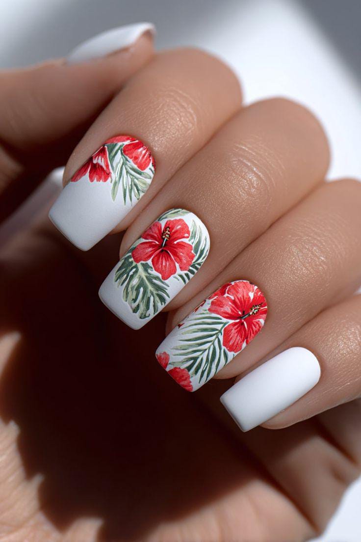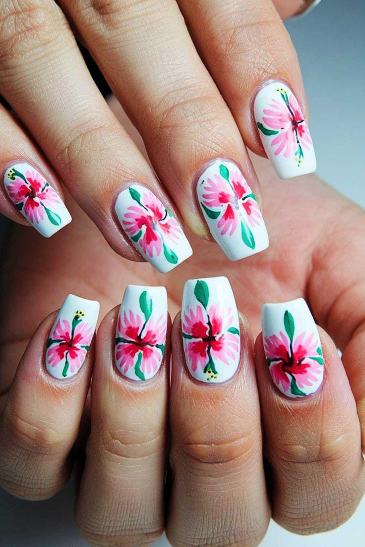 Bright white nails are painted with colorful pink hibiscus flowers and green leaves, creating a lively and hand-painted island-inspired statement.