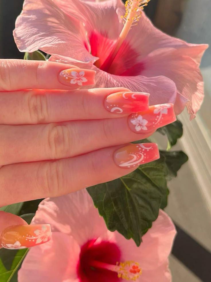 This design blends warm coral and peach ombré tones with soft white hibiscus flowers and swirls, creating a tropical sunset effect that feels both vibrant and calming.