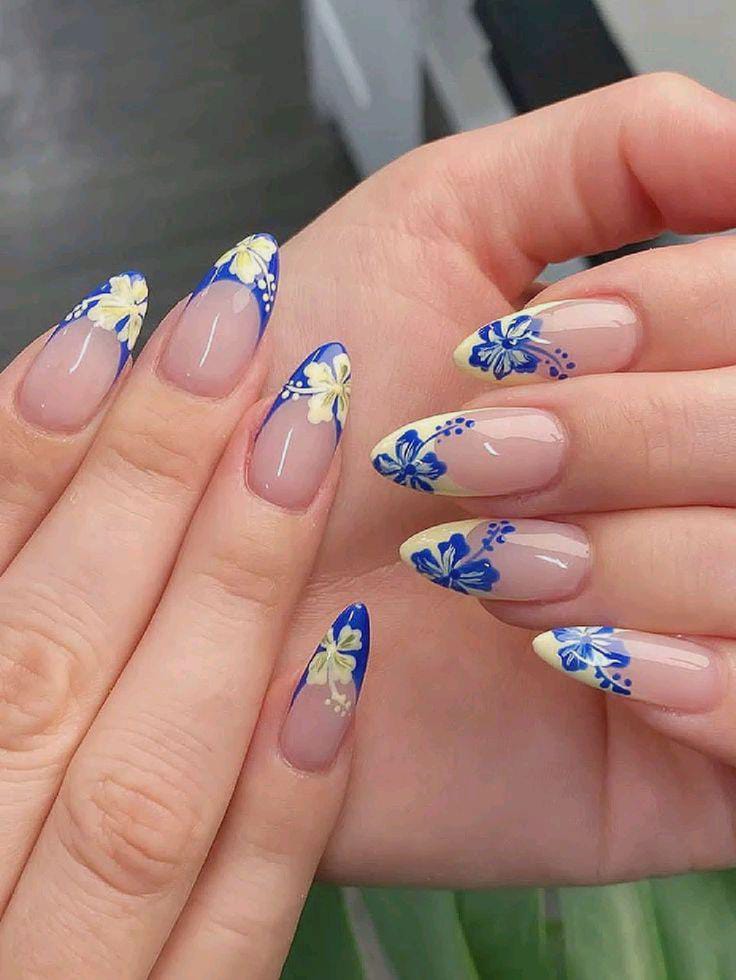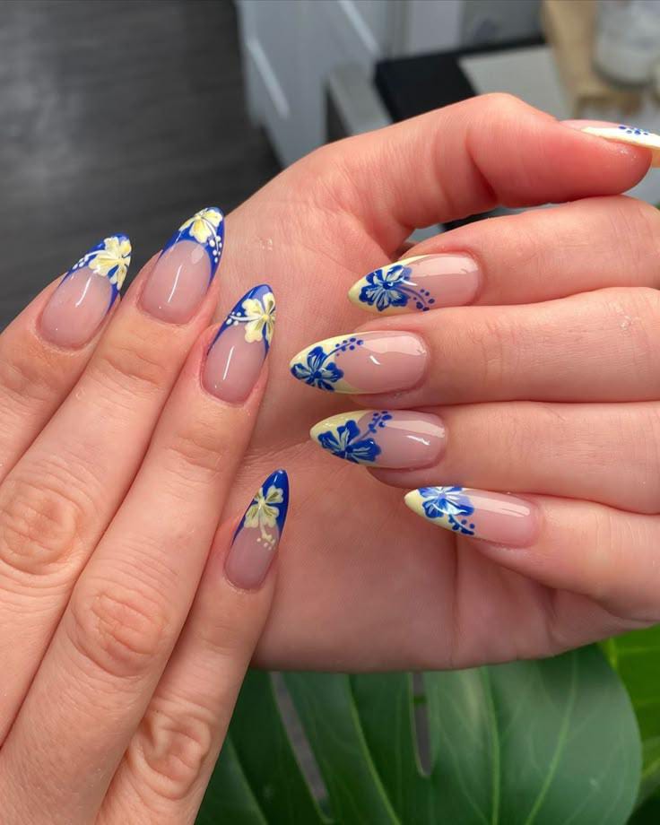 With bold blue and yellow tips accented by hibiscus flowers, this design gives off a fresh, breezy feel that instantly reminds you of the ocean.