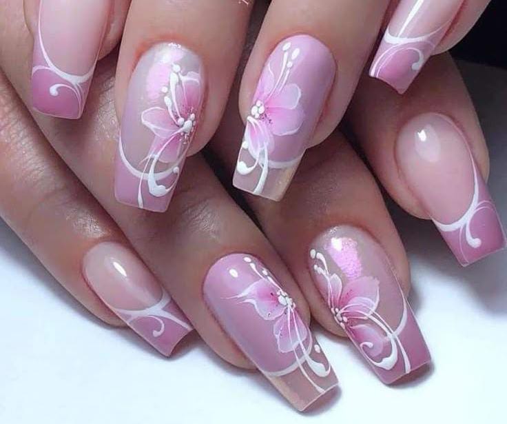 A delicate mix of soft pink hues with hand-painted hibiscus flowers and white swirls creates a graceful, feminine look. The subtle shine and gentle detailing make this style romantic.