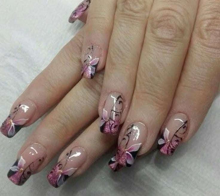 This design combines dark, glittery tips with pink hibiscus blooms and intricate black swirls, giving the nails a mysterious yet glamorous touch..