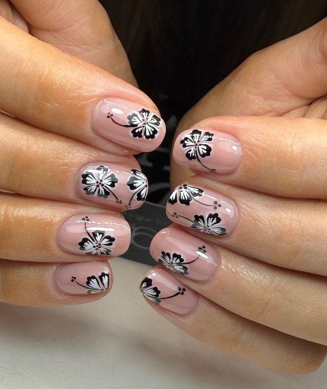 Classic and striking, these nails feature black and white hibiscus blooms over a nude base, creating a sophisticated contrast that feels both bold and elegant.