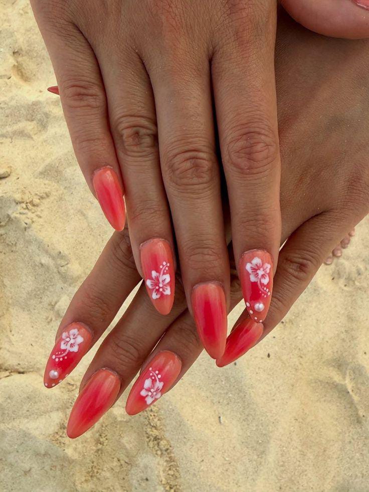 Featuring bright coral nails adorned with white hibiscus flowers and dotted accents, this design radiates tropical energy.
