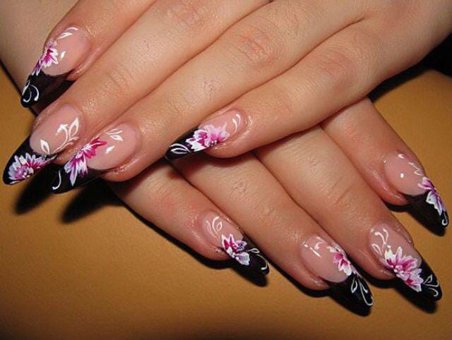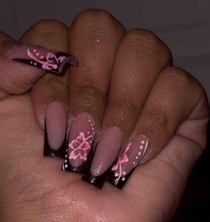 Set against deep black French tips, pink hibiscus accents and dotted details give these nails a dramatic yet feminine touch perfect for evening glam.