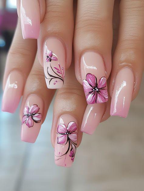 With a soft pink base and carefully detailed hibiscus blossoms, this design brings a romantic and graceful look to the nails.