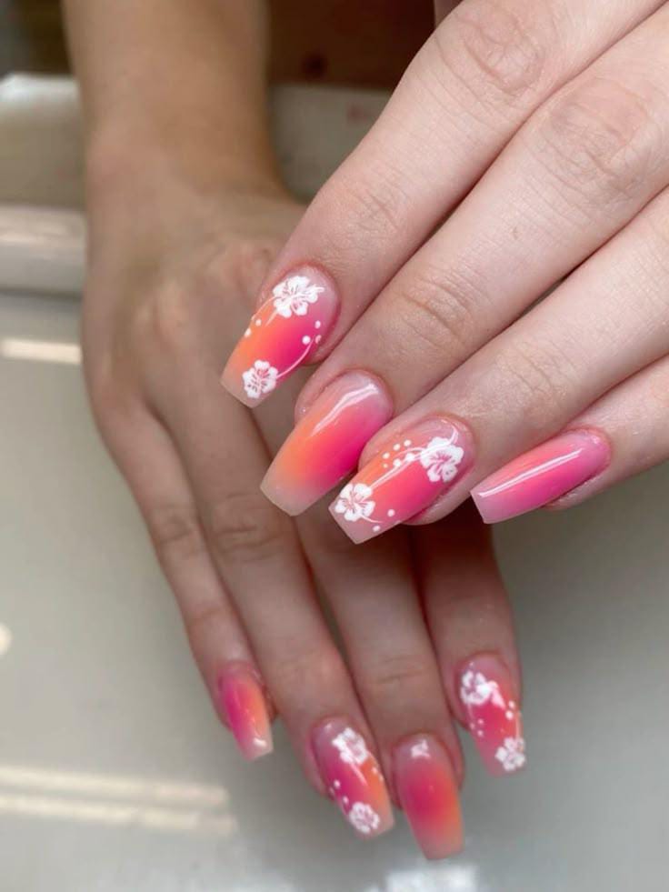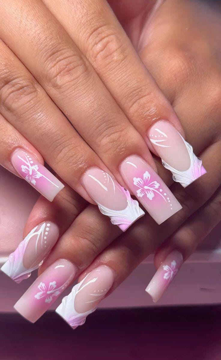Square-shaped nails in pink ombré tones feature white hibiscus flowers and graceful accents, creating a feminine and romantic look.