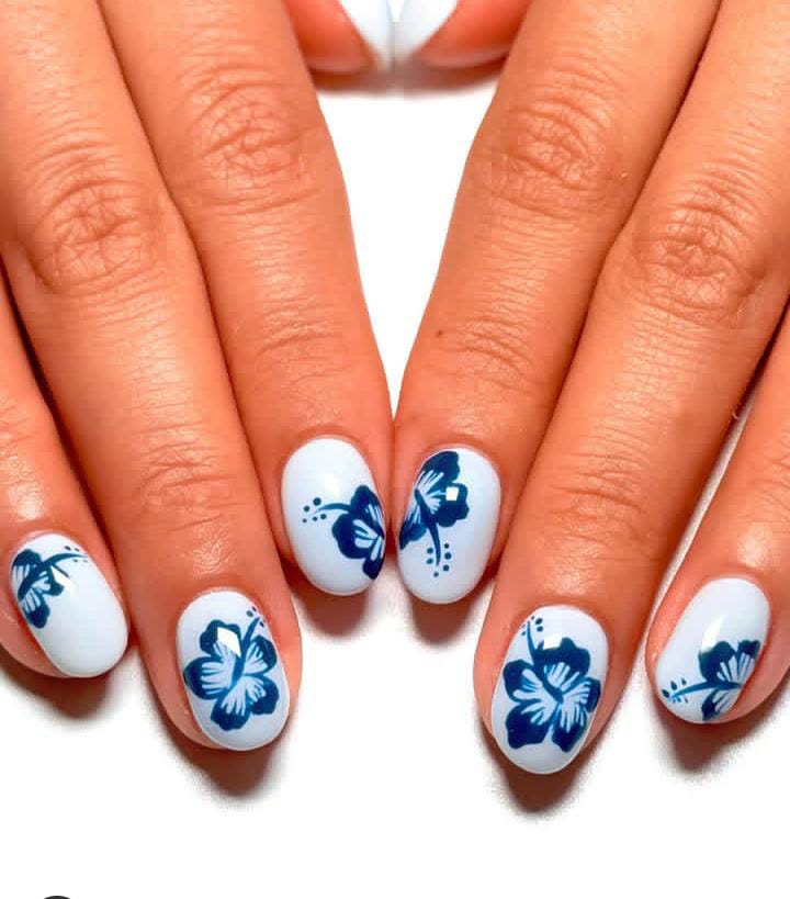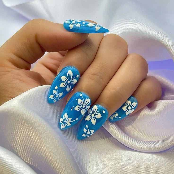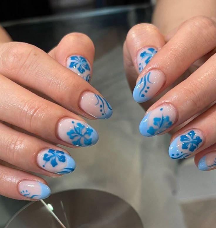 Soft nude nails blend into sky-blue tips, detailed with hand-painted blue hibiscus flowers and delicate swirls, giving a refreshing tropical vibe.