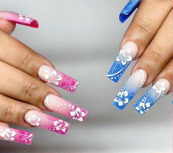 A striking mix of pink and blue ombré nails adorned with crisp white hibiscus flowers and dotted details, evoking a vibrant, beachy feel.