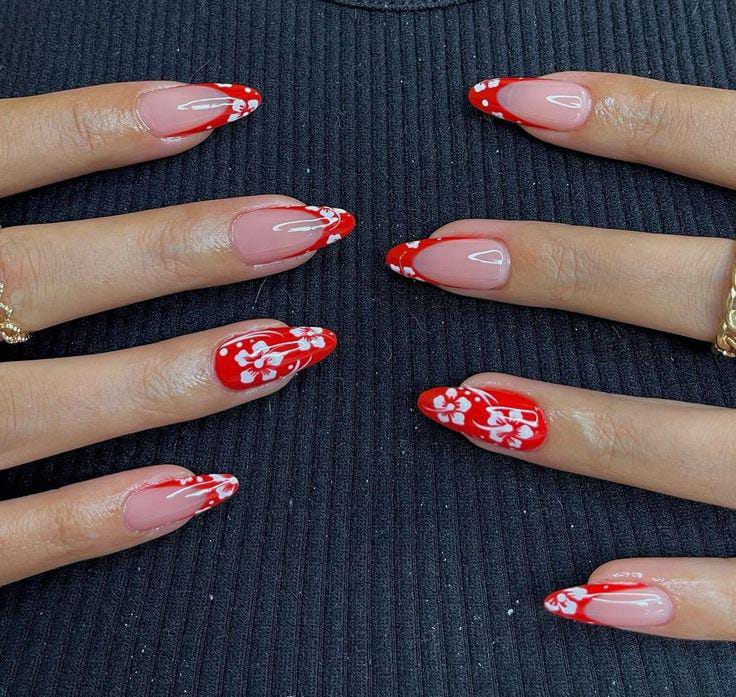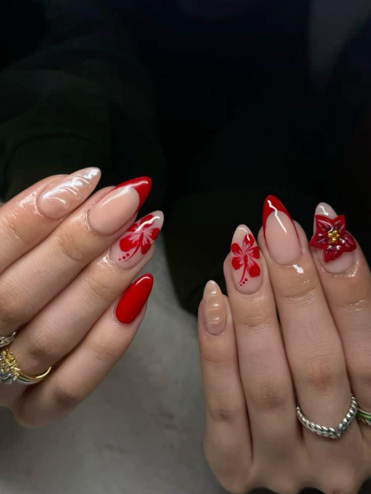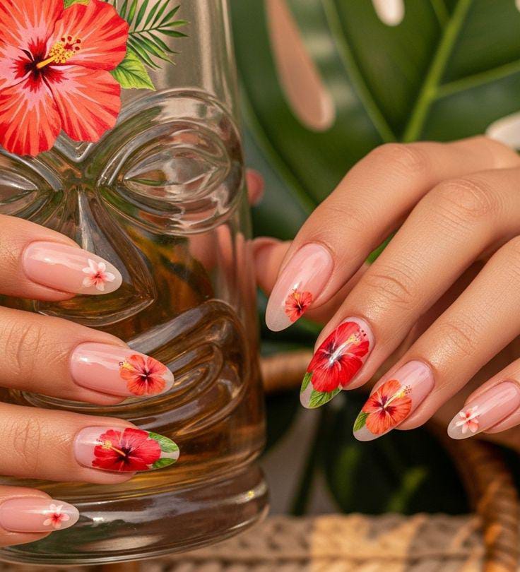 A striking mix of glossy red and nude tones with delicate hibiscus flowers, creating a bold yet feminine tropical vibe.