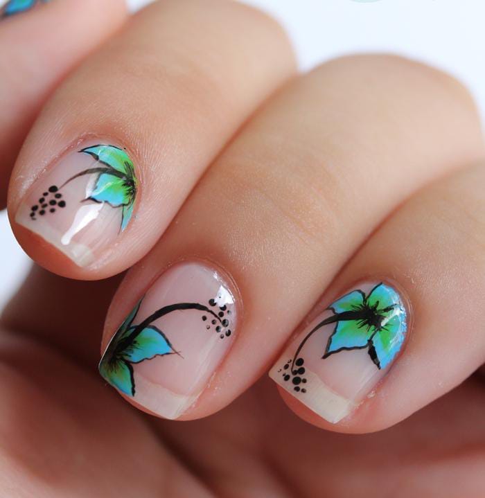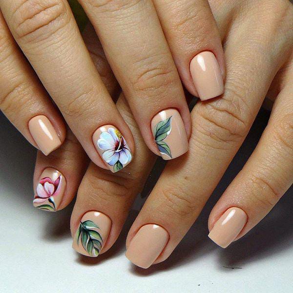 Soft nude polish paired with hand-painted hibiscus flowers and leafy accents, creating an elegant, natural garden-inspired style.