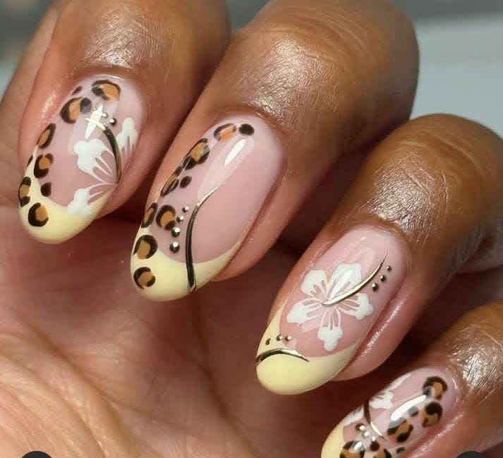 This playful mix combines animal print with creamy yellow tips and white hibiscus accents, giving the nails a chic, adventurous, and stylishly exotic flair.