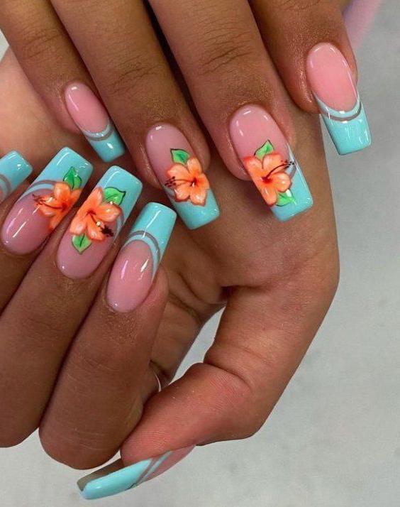 Baby blue French tips adorned with vivid orange hibiscus blooms create a fun, beachy vibe that feels like summer on your nails.