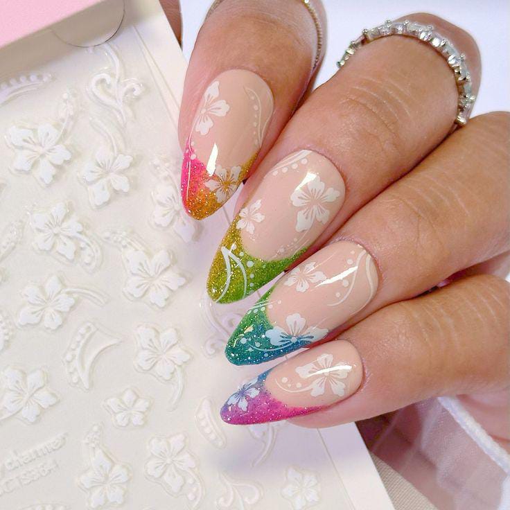 With a nude base and glittery rainbow ombre tips decorated with delicate white hibiscus outlines, this design is playful and vibrant.