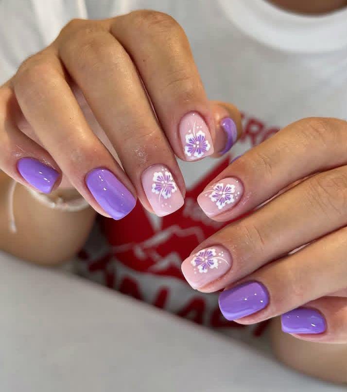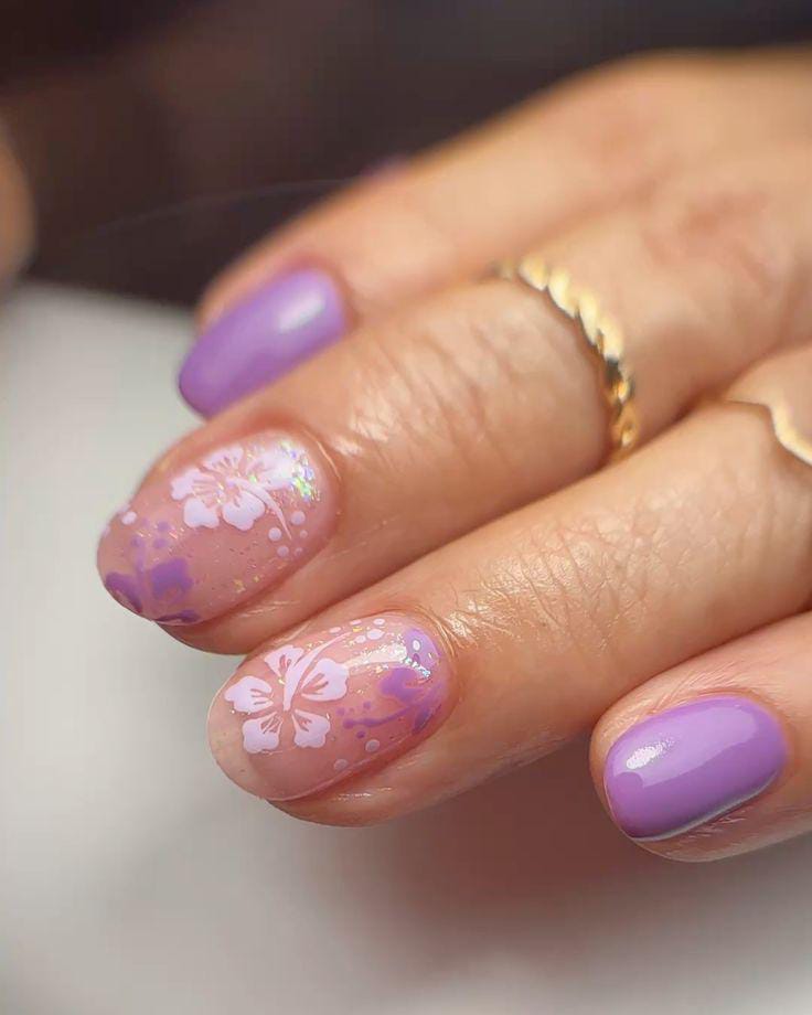 Soft purple nails paired with nude bases featuring delicate lavender hibiscus flowers, blending elegance with a breezy island style.