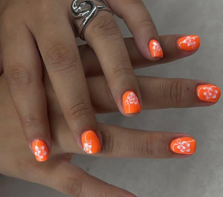 Bright orange nails with accent nails showcasing detailed hibiscus-style floral art on a crisp white base, perfect for a bold, sunny statement.