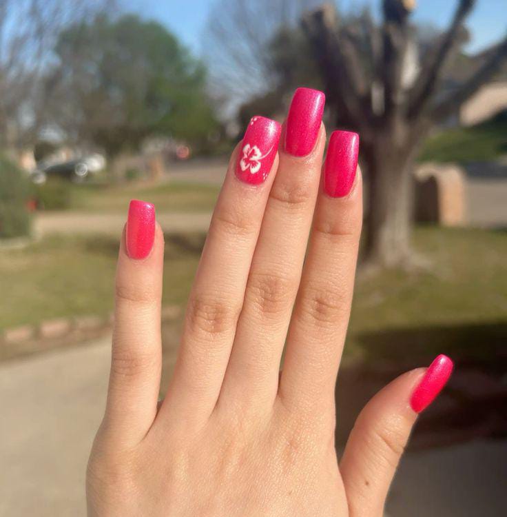 Bright hot pink nails with a glossy finish, highlighted by a single white hibiscus bloom for a fun, summery look.