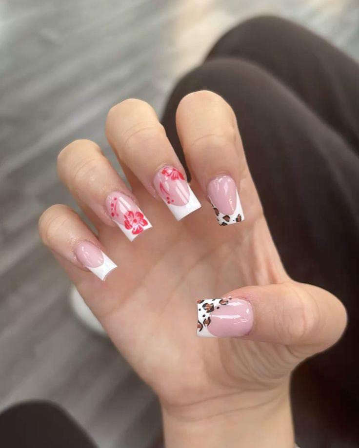 A playful mix of pink florals and leopard print on French tips, blending tropical charm with a bold, trendy twist.