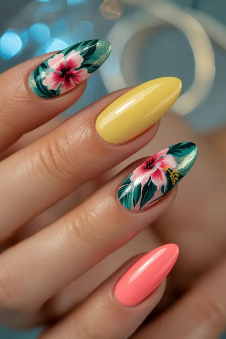 A bold mix of glossy coral and yellow nails paired with green-tipped nails featuring hand-painted pink hibiscus blooms, giving a lush tropical vibe.