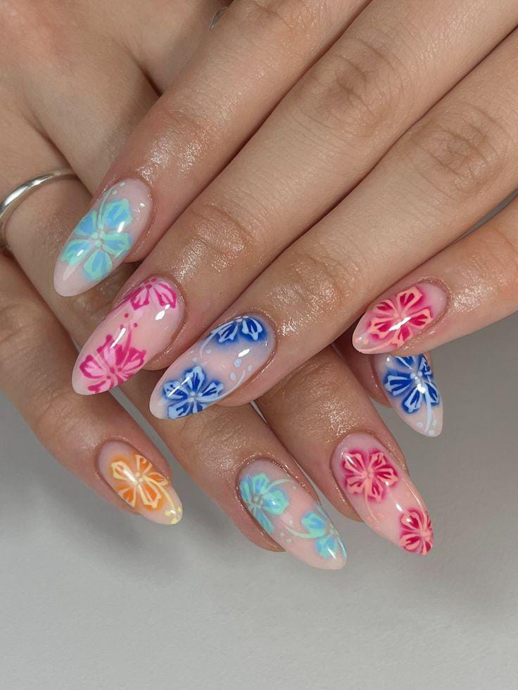 Clear and nude bases decorated with vibrant hibiscus flowers in neon pink, blue, orange, and aqua create a playful and summery look.