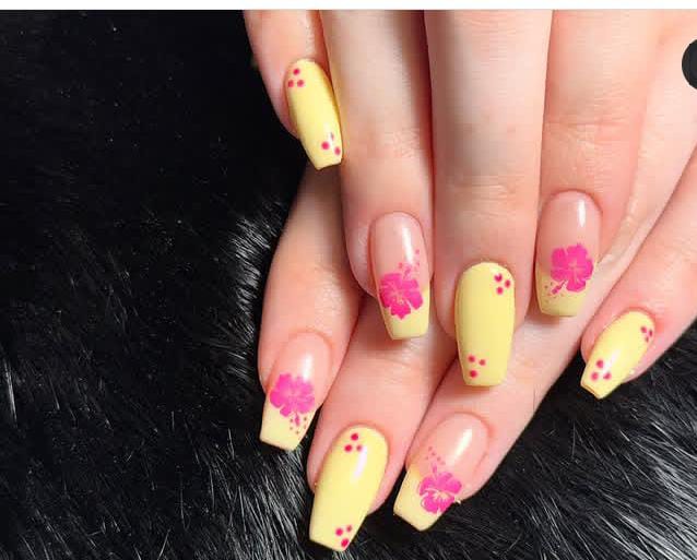Cheerful yellow nails balanced with nude bases adorned with small pink hibiscus flowers and dots, bringing a fresh and fun summer feel.