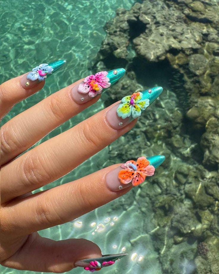 Vibrant 3D hibiscus flowers in pink, orange, and yellow bloom atop shimmering aqua french nails, making this design bold, artistic, and vacation-ready.