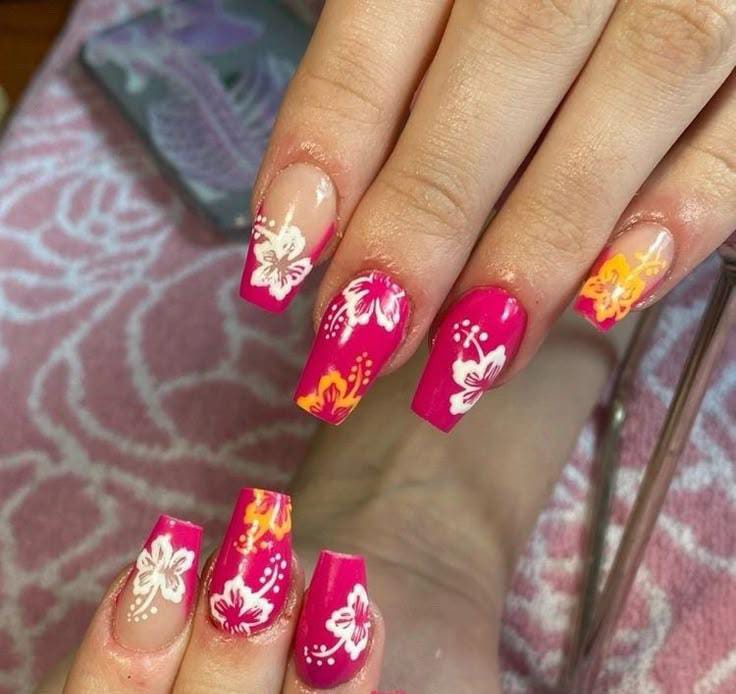 Bright pink nails decorated with white and yellow hibiscus blooms, giving off a lively, summer-ready feel.
