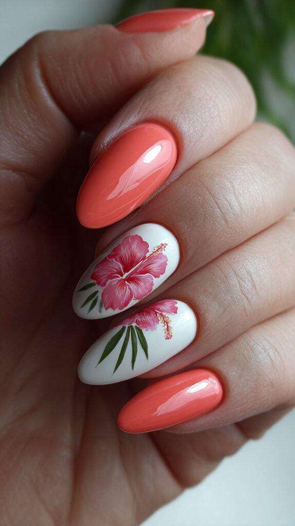 A fresh blend of coral polish with detailed hibiscus art on white, offering a soft but vibrant floral charm.