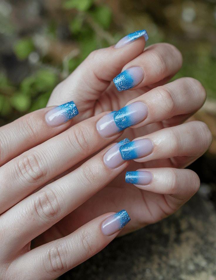 This look features a cool blue glitter ombré that gently fades from the tips into a soft, natural base, giving the nails a fresh, icy winter vibe. It’s simple yet striking—perfect for a crisp January aesthetic.