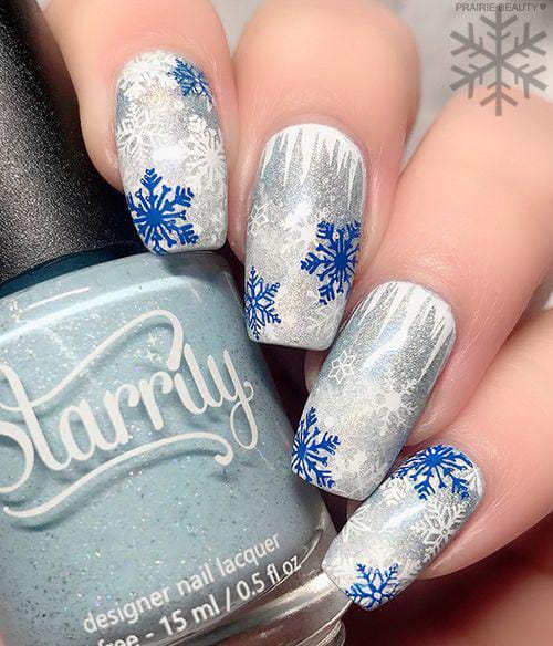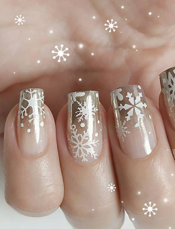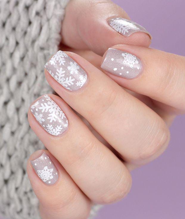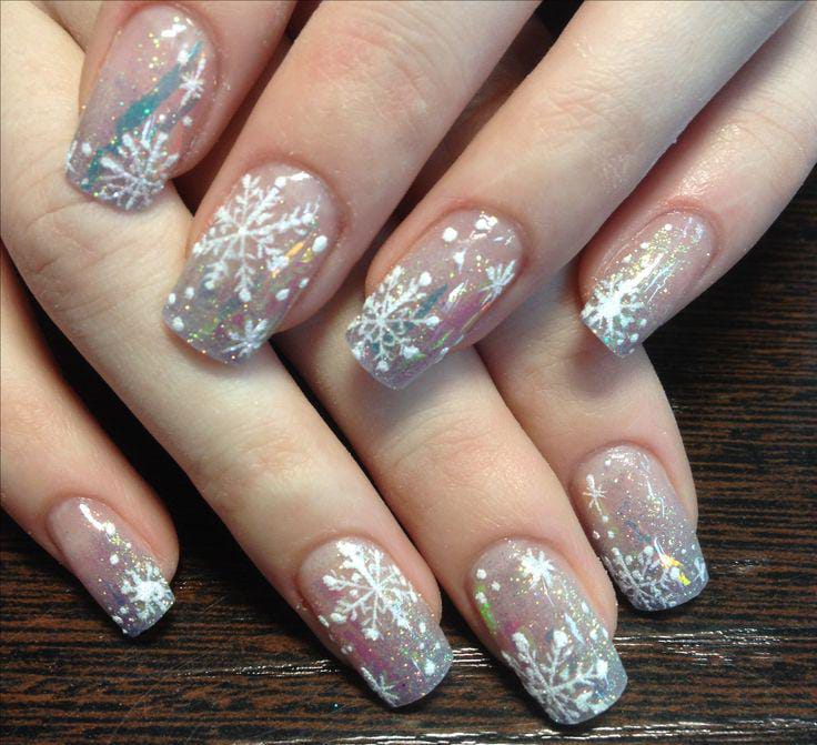 Iridescent glitter overlays and white snowflakes create a delicate, frosty look that sparkles without overpowering. The soft neutral base keeps it clean, bright, and very January-appropriate.