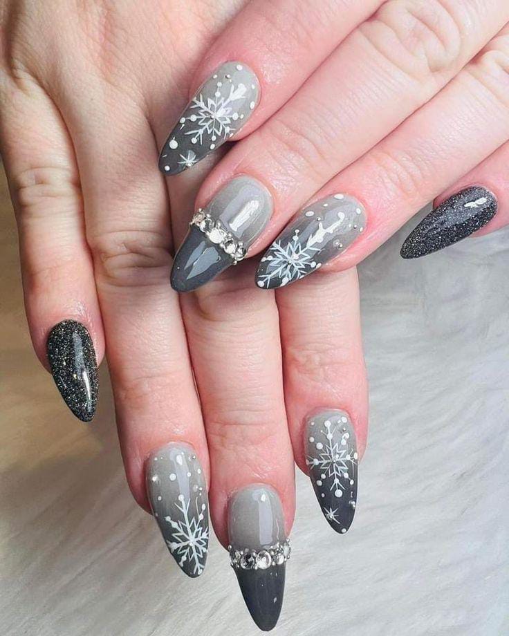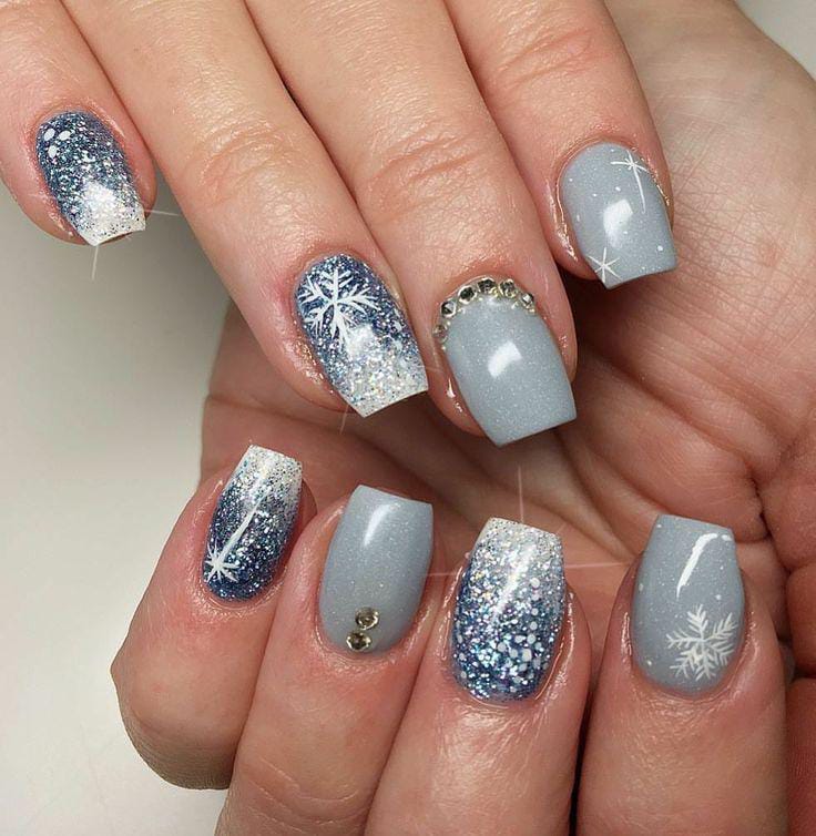 This design mixes soft gray tones with glittery accents and delicate snowflake art, giving the nails a frosty, wintry glow. The added rhinestones and shimmering gradients make the look elegant and cold-weather January inspired.