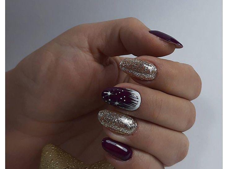 Deep plum polish contrasts with bright gold glitter and a starry accent nail, creating a dramatic night-sky effect. It’s a bold yet festive January look with plenty of sparkle.