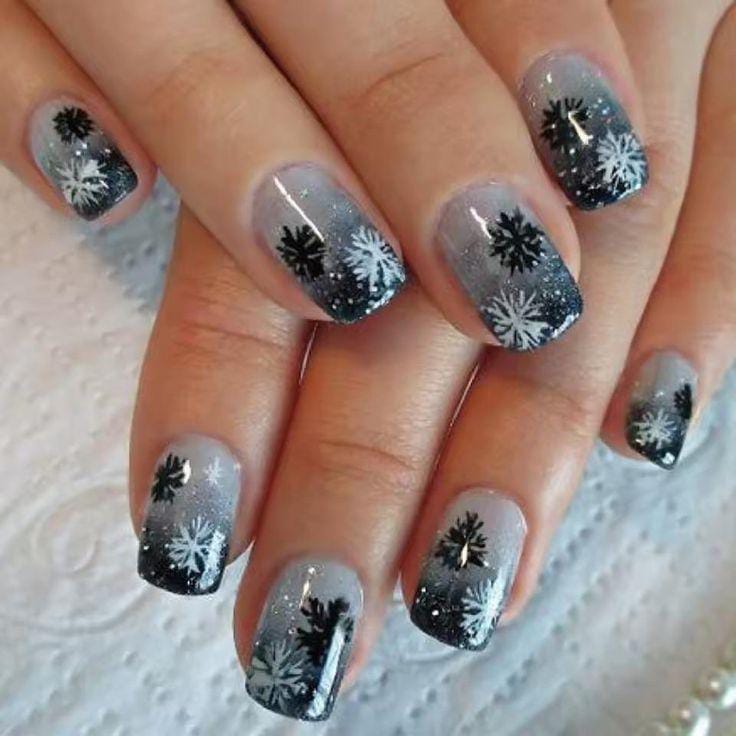 A cool gray-to-black ombre creates the perfect backdrop for white and black snowflake motifs, giving the nails a crisp and wintry January finish. The subtle shimmer adds softness while keeping the look seasonal.