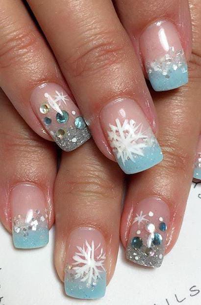 Light blue and silver glitter tips blend gently into a natural base, decorated with white snowflakes and small rhinestones. The look is delicate, fresh, and perfect for a soft January aesthetic.